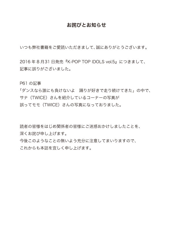 『K-POP TOP IDOLS vol.5』につきましてお詫びと訂正